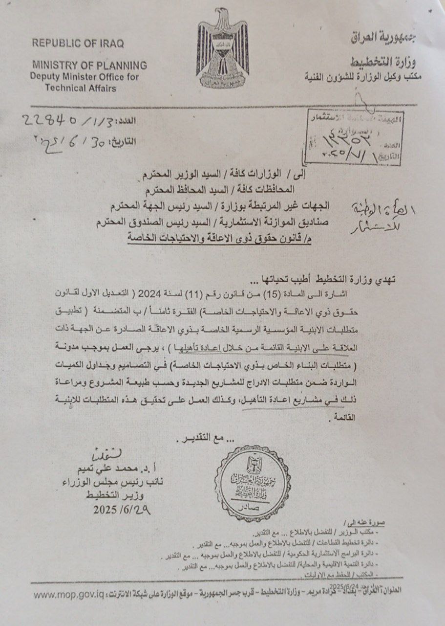 نرفق لكم صورة عن كتاب وزارة التخطيط /مكتب وكيل الوزارة للشؤون الفنية ذي العدد (22840/1/3) في 2025/6/30. والمتضمن العمل بموجب مدونة (متطلبات البناء الخاص بذوي الإحتياجات الخاصة) في التصاميم وجداول الكميات الواردة ضمن متطلبات الإدراج للمشاريع الجديدة وحسب طبيعة المشروع ومراعاة ذلك في مشاريع إعادة التأهيل، وكذلك العمل على تحقيق هذه المتطلبات للأبنية القائمة.. مع التقدير.قانون حقوق ذوي الإعاقة والإحتياجات الخاصة