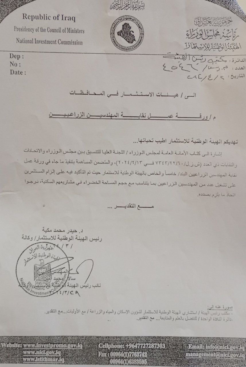 نرفق لكم صورة عن كتاب الهيئة الوطنية للإستثمار بالعدد (4546) في 2024/4/2 والمتضمن تشغيل عدد من المهندسين الزراعيين بما يتناسب مع حجم المساحة الخضراء في المشاريع الإستثمارية السكنية وكذلك مساحة المشروع الإستثماري الزراعي... مع التقدير.تشغيل المهندسين الزراعيين